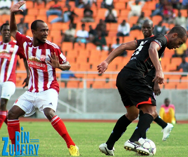 Mwinyi Kazimoto akigombea mpira wa juu na kiungo wa Libolo