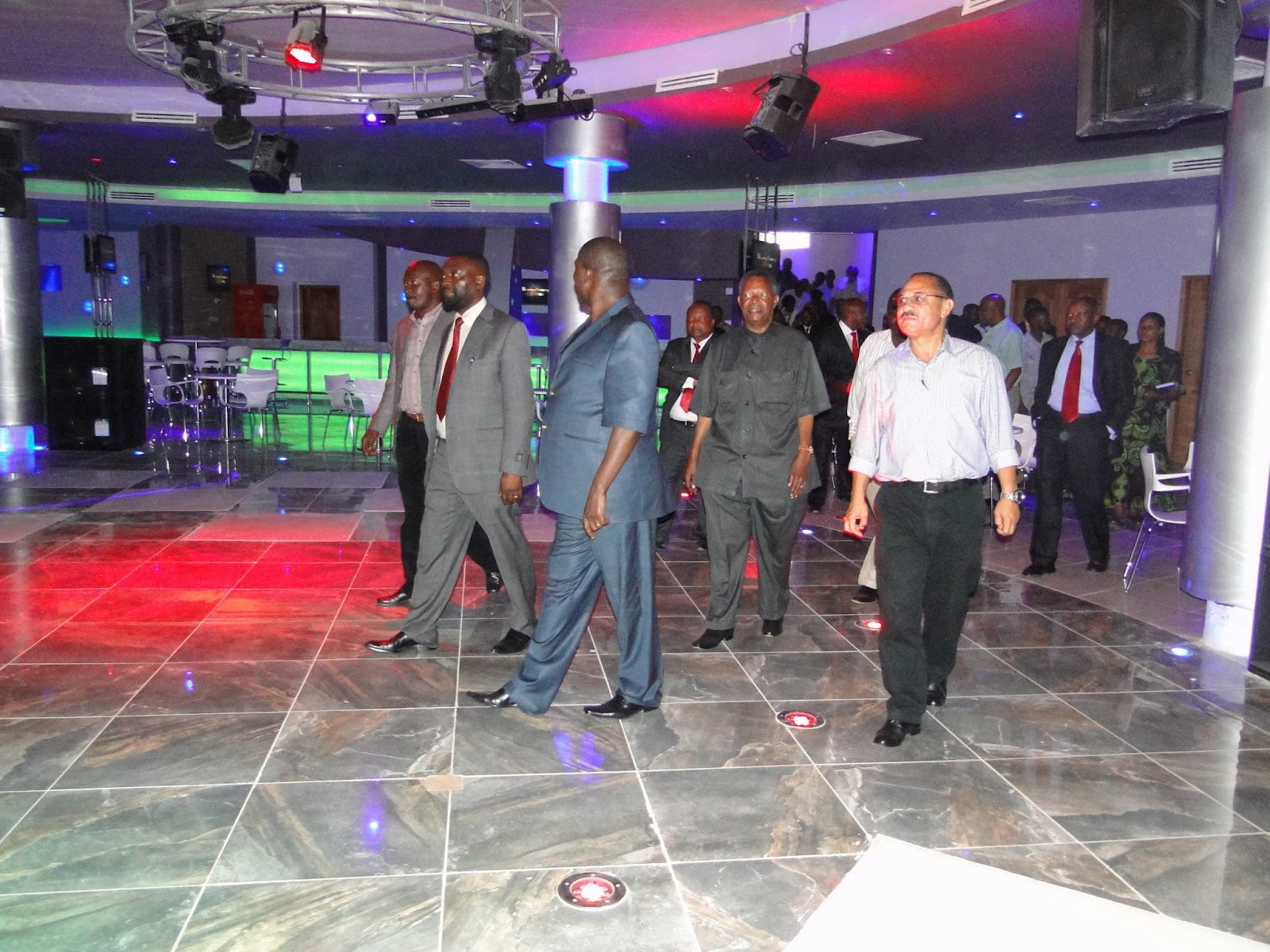 mkuu wa mkoa akiwa na vingozi wengine pamoja na wageni waalikwa wakiangalia jinsi jengo hilo lilivyo ndani hapa wapo ndani ya ukumbi wa disco