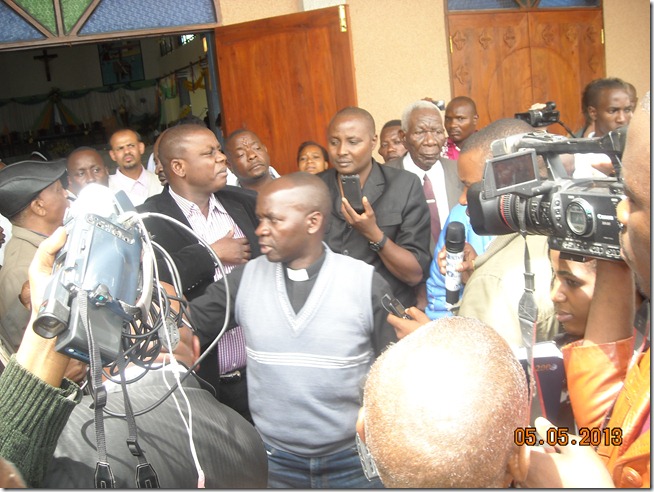 Viongozi wa Kanisa wakitoa taarifa ya kilichotokea kwa waandishi wa habari kabla ya Balozi wa Papa kuondolewa Kanisani hapo chini ya ulinzi mkali wa Polisi.