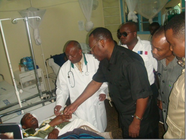 Mh Mbowe akimjulia hali Apolinary Malamsha aliyelazwa hospitali ya St Elizabeth. Hospitali hiyo ina majeruhi 20 na baadhi yao bado wana vyuma vya bomu mwilini.