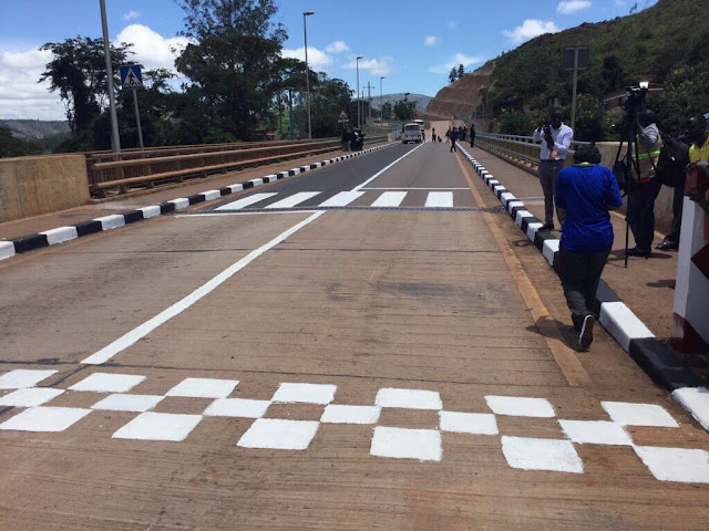 Rais wa Jamhuri ya Muungano wa Tanzania Mhe. Dkt. John Pombe Magufuli pamoja na Rais wa Rwanda Mhe. Paul Kagame wakipita kwenye Daraja hilo la Rusumo mara baada ya uzinduzi
